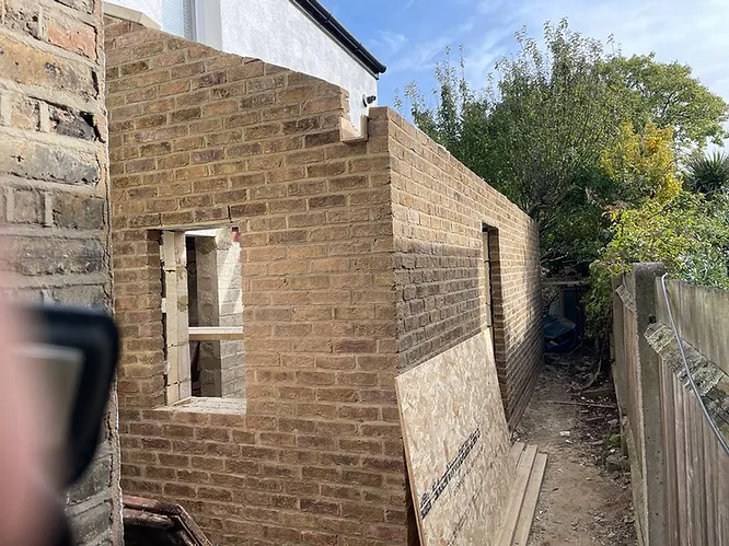 Bricklaying for the extension follows the same method as the main house. The new walls are bonded or tied to the existing walls using metal ties or toothing techniques for strength and stability.